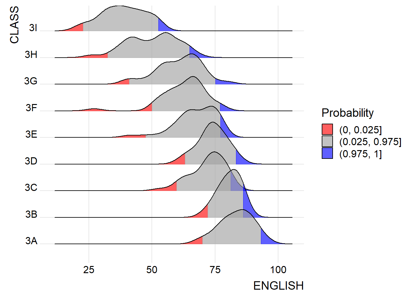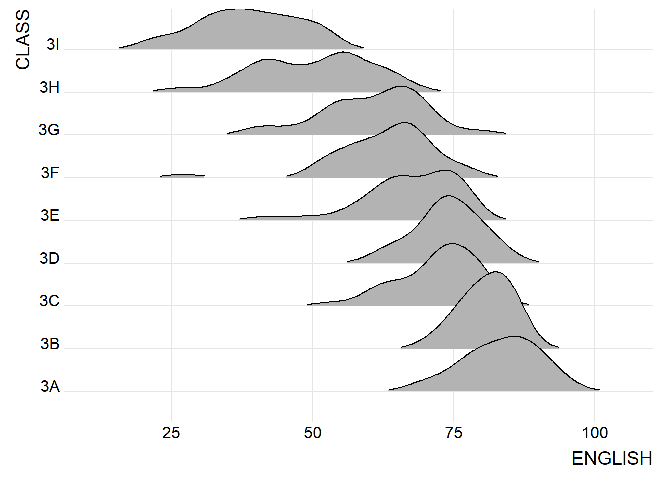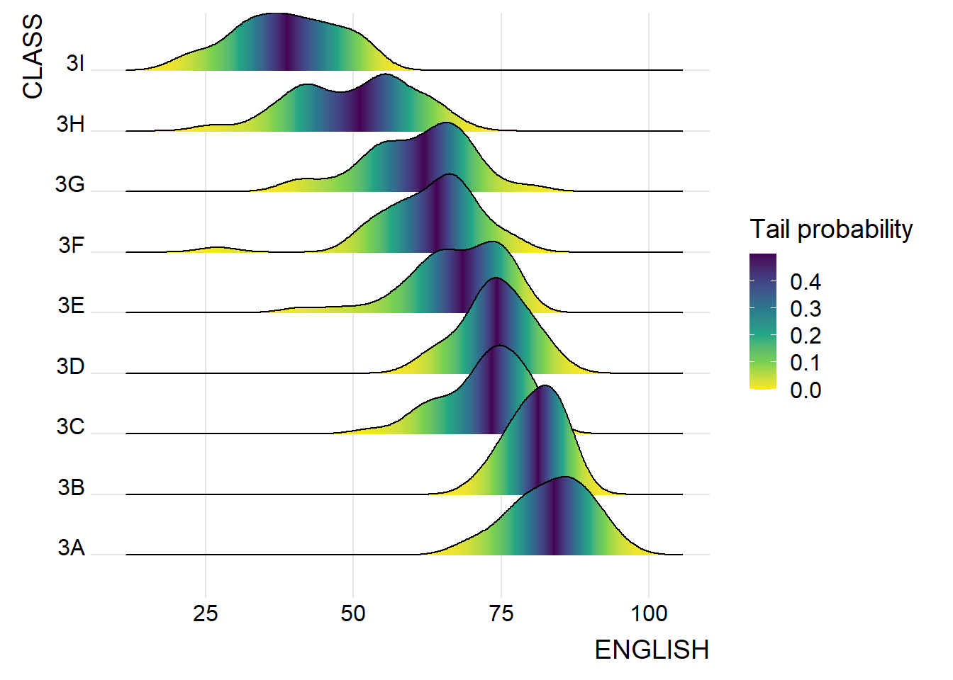 Below is an example to compare the distribution of English scores across classes through ridgeline plot.