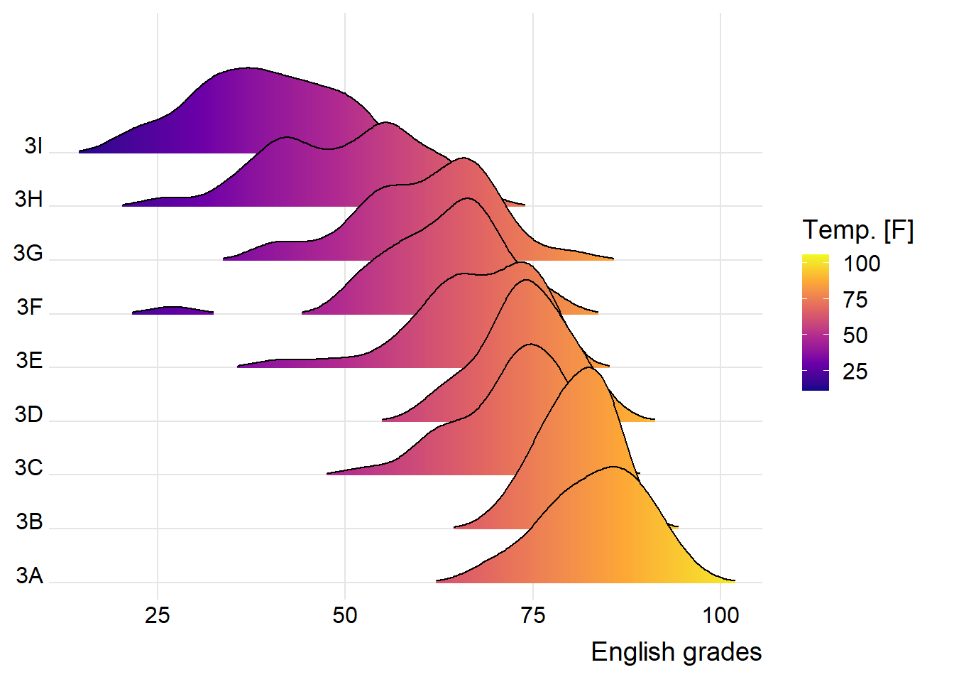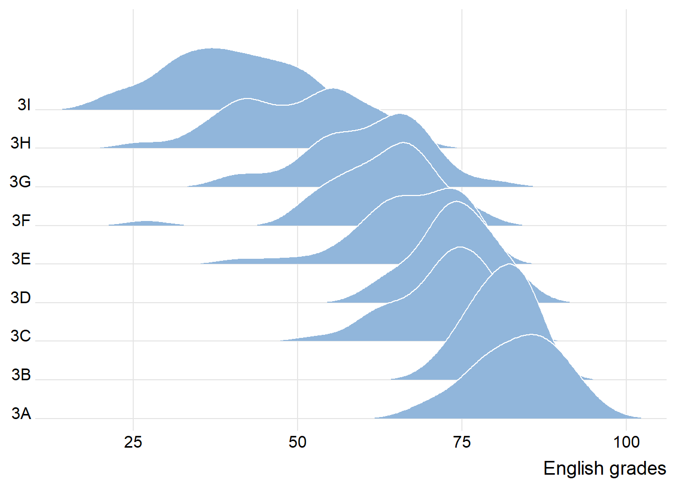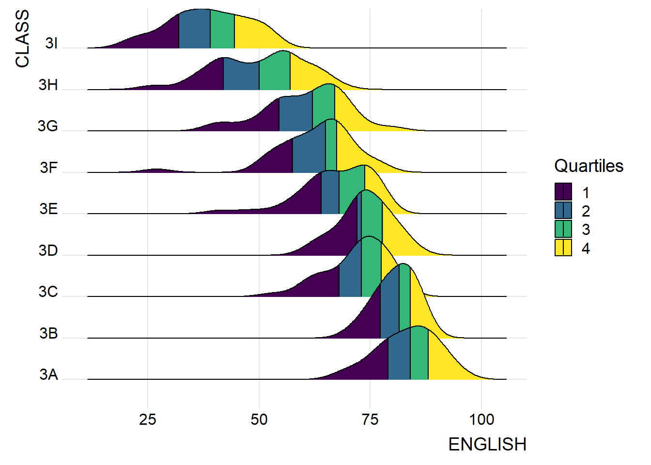 Below is an example to compare the distribution of English scores across classes through ridgeline plot.