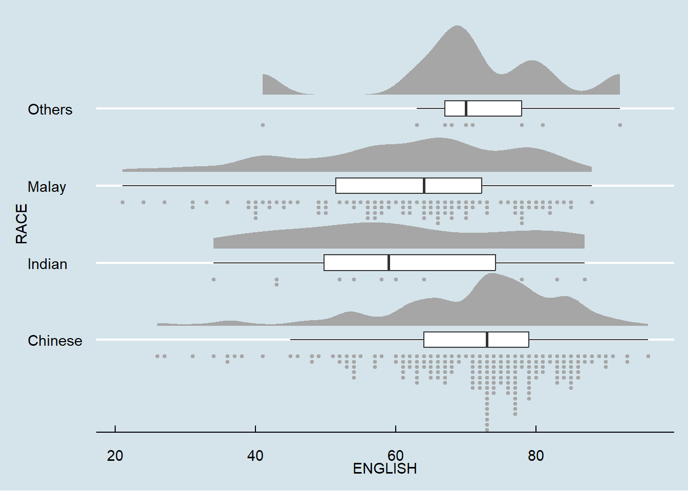 In this section, we will learn how to create a raincloud plot to visualise the distribution of English score by race. It will be created by using functions provided by ggdist and ggplot2 packages.
