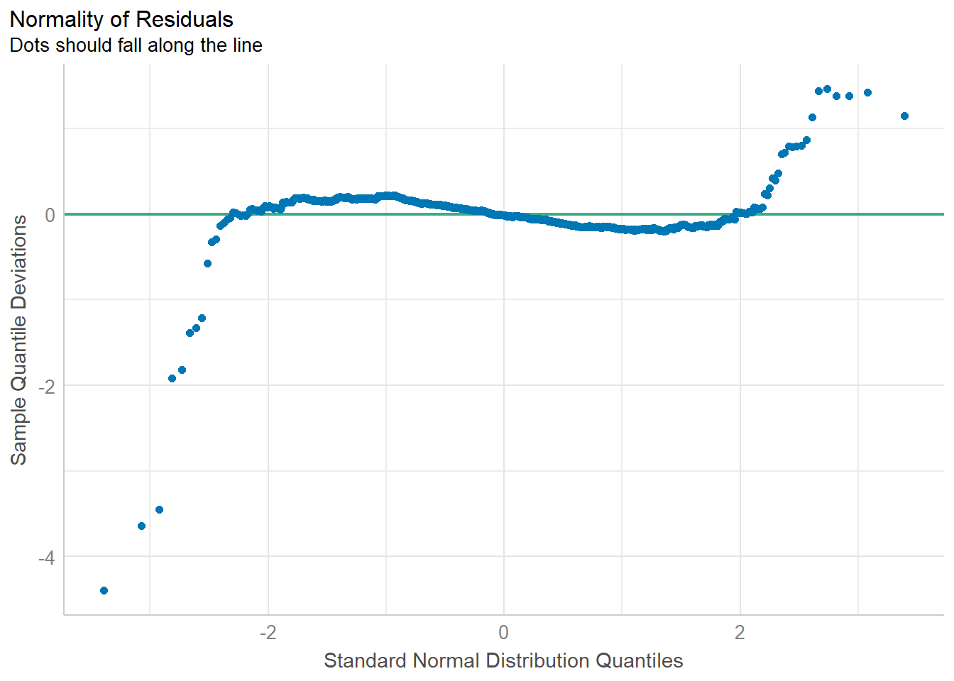 The plot above shows that some residuals are not along the 0 reference line, which indicates that the residuals are not normally distributed.