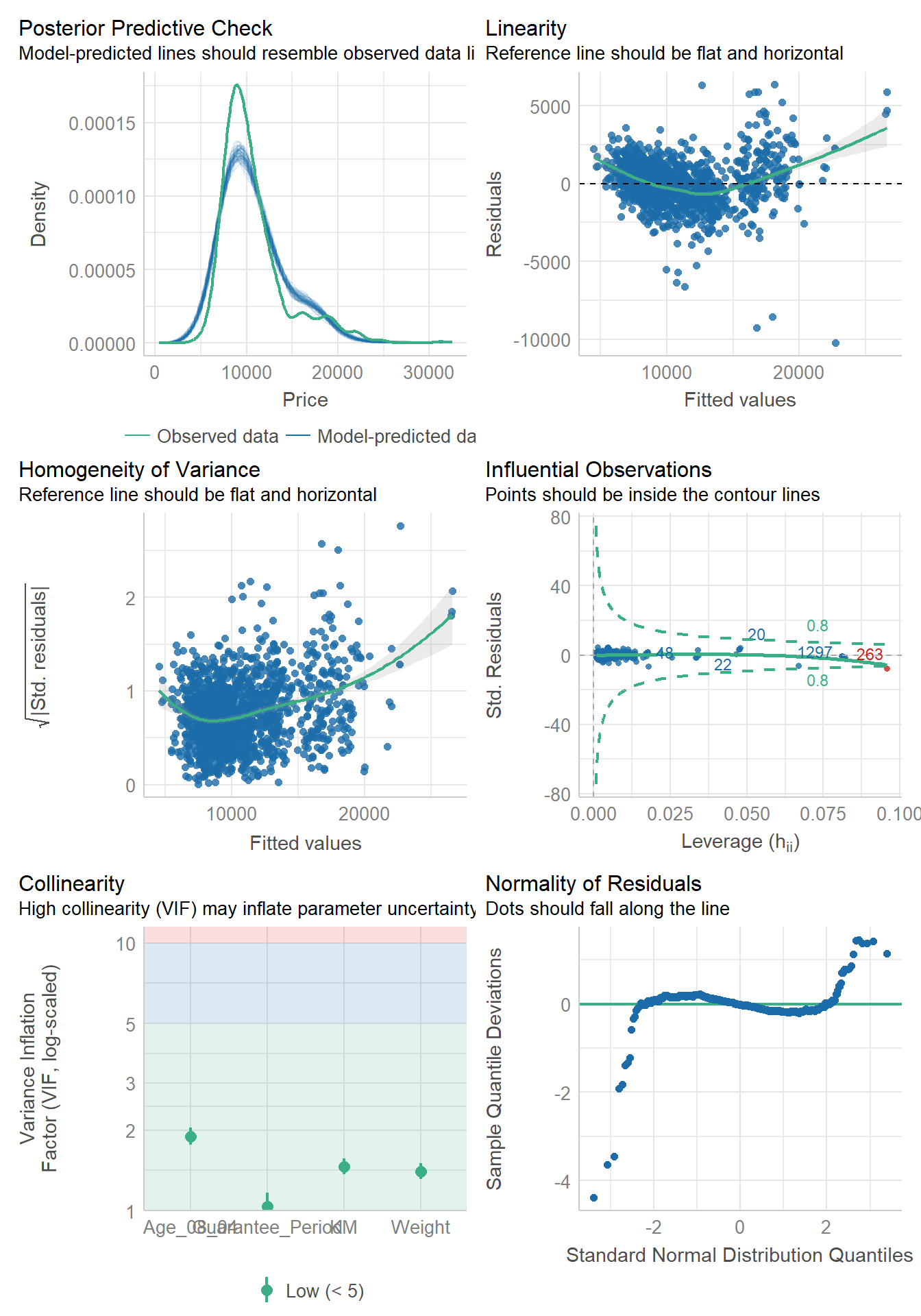 We can also perform the complete checkings by using check_model() function.