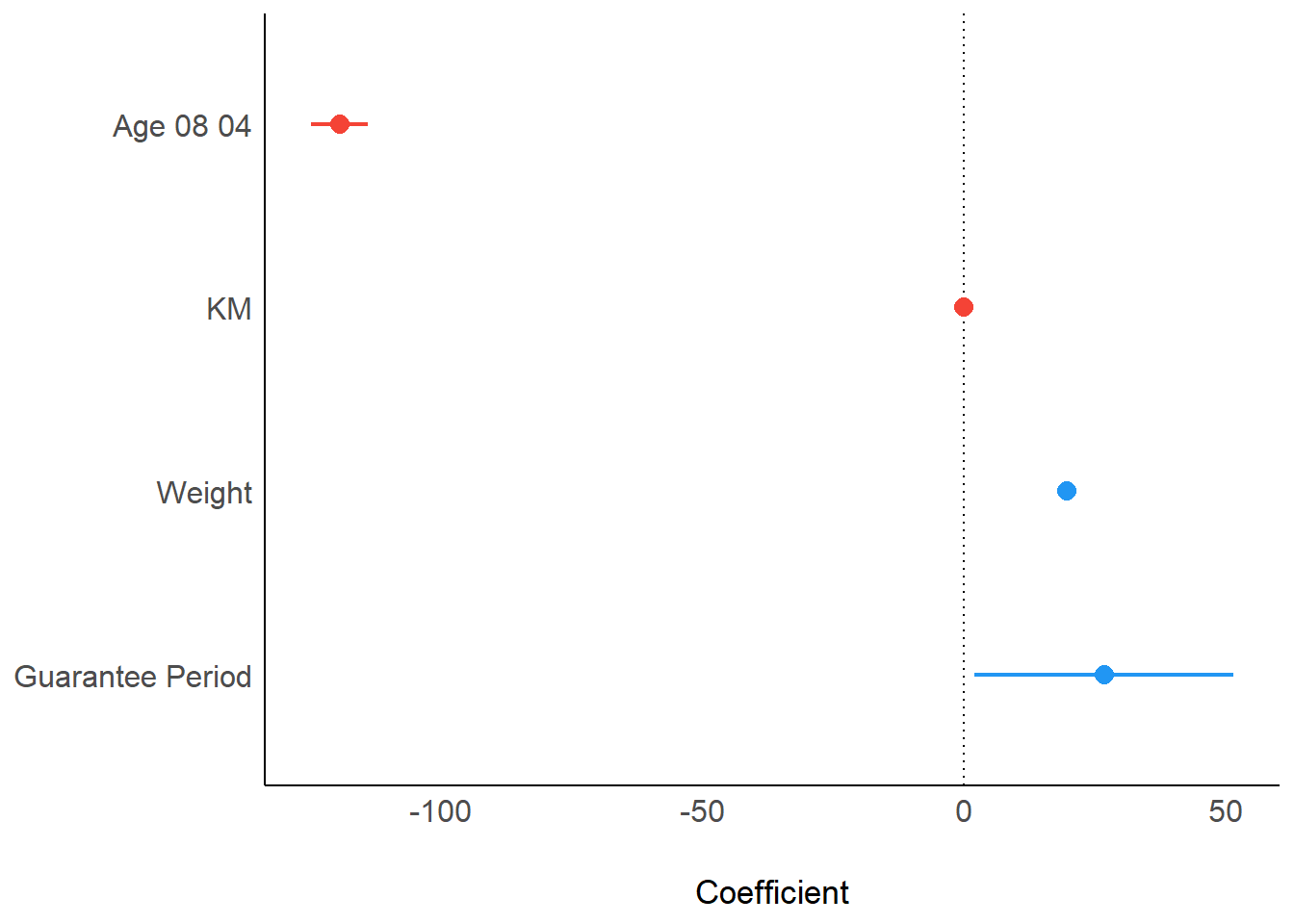 It’s clear from the plot above that Age_08_04 and KM have negative impact on the price, whereas weight and guarantee period have positive impact on the price.