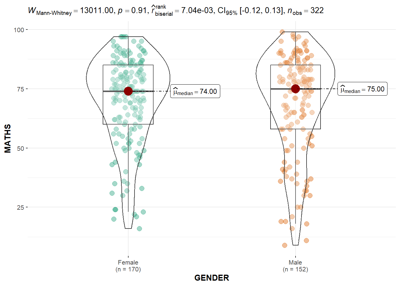 The Mann-Whitney statistic is displayed on the plot to tell if the two distributions are significantly different. Since the p-value is larger than 0.05, we can conclude that the maths scores between female students and male students are not significantly different at 5% significance level.