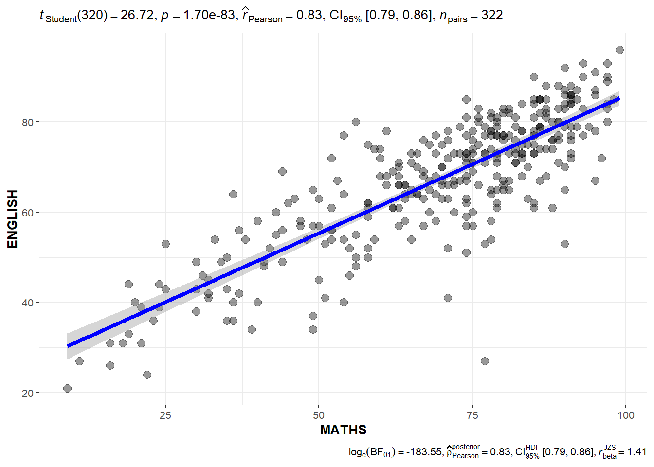 The plot above shows that there is a strong positive correlation between English scores and Maths scores, as the Pearson correlation coefficient is 0.83.